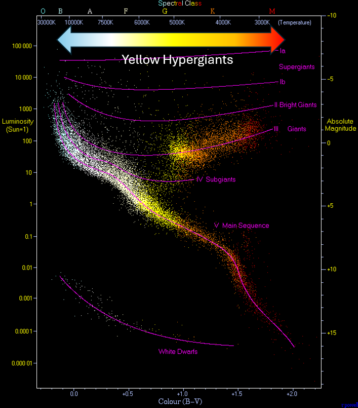Yellow Hypergiants are very massive stars, that began their life as hot O class stars more than 15 times the mass of our sun. When massive stars start burning out their fuel, the star leaves the main branch of the H-R Diagram where the star begins to swell into a red supergiant. This is where the star starts to cool. During the transition to a red supergiant phase, it passes through what is called the “Yellow Evolutionary Void” where the star goes from being blue to red. Because these stars are unstable, they fluctuate in size, When the red supergiant begins to shrink again, it passes through this phases back to blue. The most luminous red supergiants may do this more than once, shedding their atmosphere.