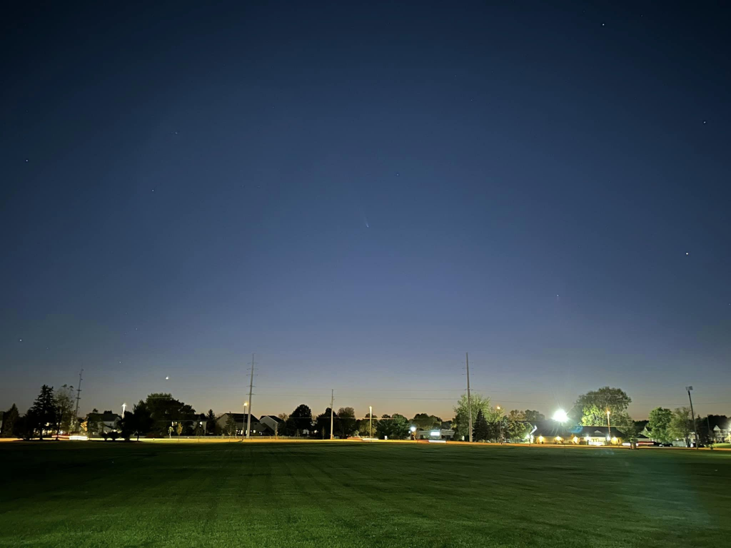 On the evening of October 16th, a neighbor and I went to a local elementary school to observe the comet. There were many parking lot lights, but I was able to get a picture with my phone.