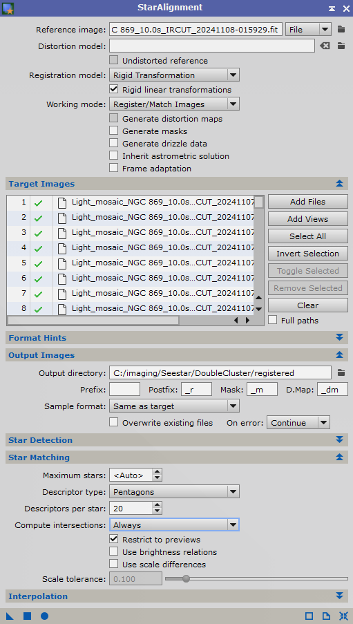 Normally, we would use Weighted Batched Pre-Processing (WBPP) but in this case, we will do each step manually. First start with debayering the light frames to get it into the RGB space, then we register using the mosaic image from the Seestar, and finally, integrate the light frames together.