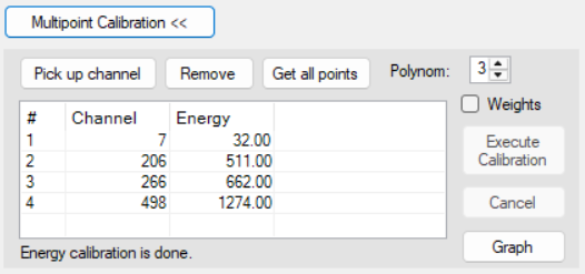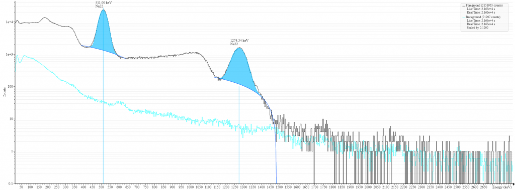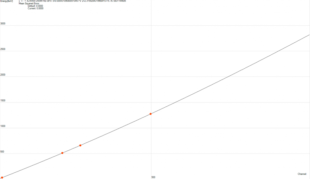 After gathering all of the data, calibration begins. Using the technique provided by Ionization Radiation Lab, using the excellent Becqmoni, I used Cs-137 and Na-22 for calibration. Specifically the following energies: