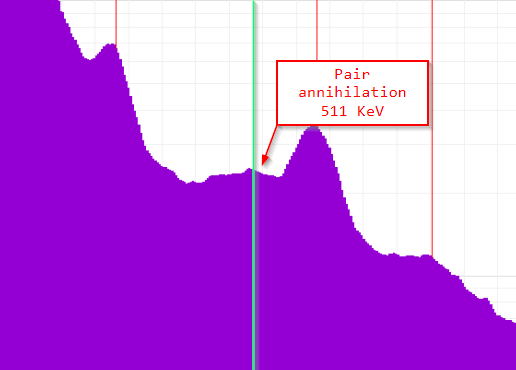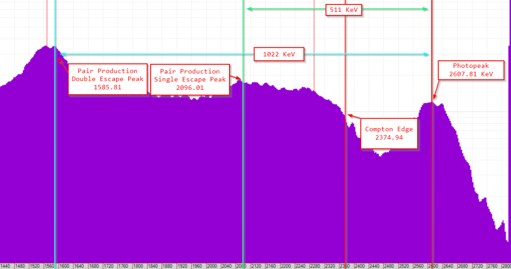 Looking more into my spectra, I noticed a small peak around 511 KeV which would correspond to Electron-Positron Pair Annihilation. When the pair annihilate each other, 2 or more photons are emitted at 511 KeV which will display in the spectra.