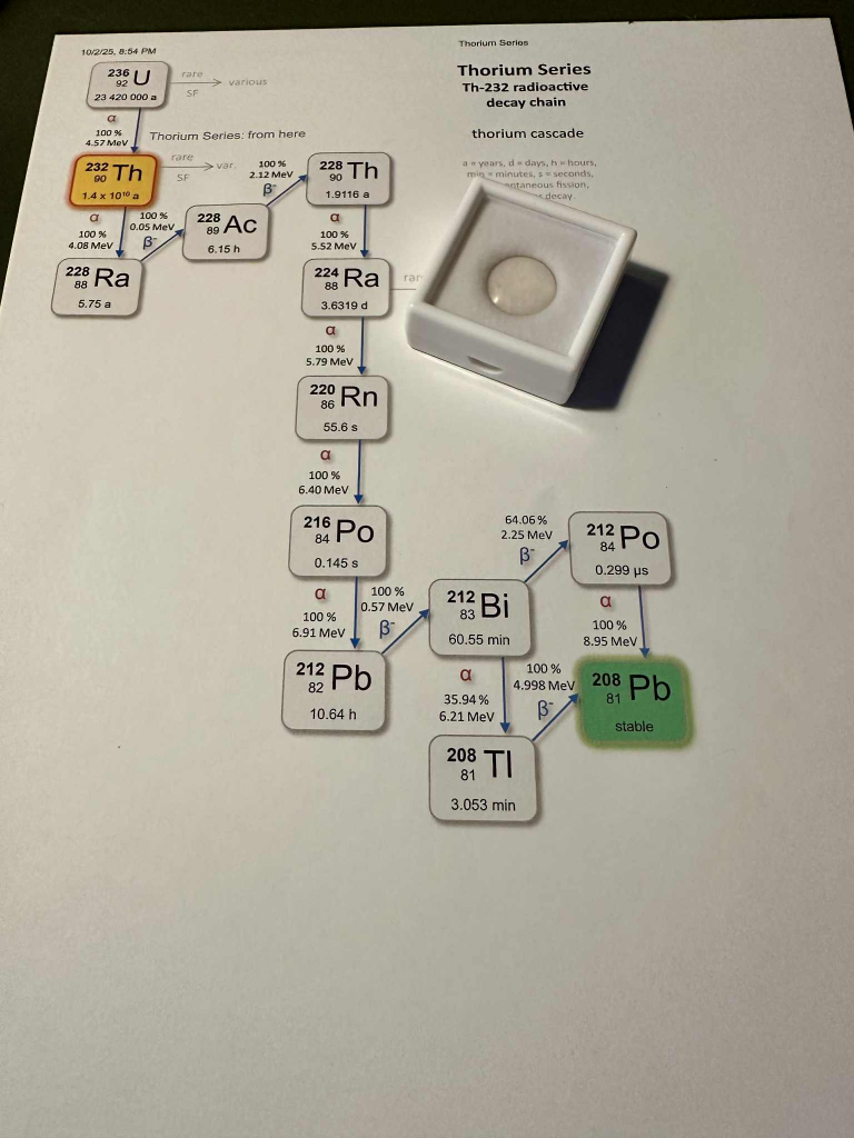 Thorium-232 is the most stable isotope of Thorium with a half-life of 14 billion years so it has been around a while (about the same as the age of the Universe). Thorium is named after the Norse God of Thor, it was discovered in 1828. You can find Thorium in commercial products like TIG welding electrodes and lantern mantles (although the mantles are not manufactured anymore due to the potential health hazards). The sample I am using is a thoriated lens that I obtained from Geigercheck.